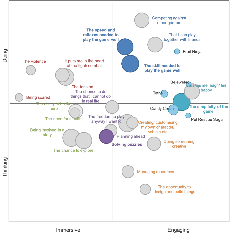 We have identified families of games that deliver the same enjoyment in play. For example; the Simple Puzzles cluster includes games like Fruit Ninja, Bejewelled, Tetris, Candy Crush and Pet Rescue. These games all deliver enjoyment through their simplicity of game play, and the skills and reflexes needed to play the games well.